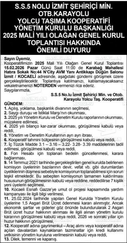 Kooperatifimizin 2025 Mali Yılı Olağan Genel Kurul Toplantısı 15.02.2026 Pazar Günü Saat 11:00 de Karabağ Mahallesi Hatıra Sokak No:44 N’City AVM Yanı Antikkapı Düğün Salonu İzmit / KOCAELİ adresinde, aşağıdaki gündemi görüşmek üzere gerçekleştirilecektir.